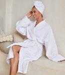100% cotton terry towelling. Two panel hair wrap.Elastic loop for fastening.Excellent absorbency qualities.